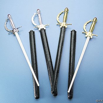 Plastic Swords. Assorted color handles with a plastic sheath. 20" 12 per package.Available at Amazon